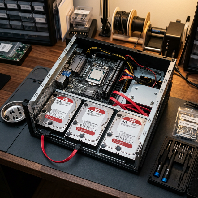 2. Schritt 2: Festplatten einbauen und SATA-Kabel anschließen. Bei mehr als 4 Platten brauchst du ggf. einen HBA-Controller (z. B. LSI 9211-8i).